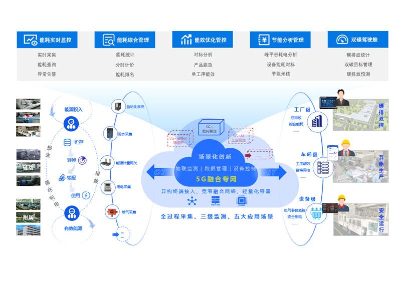 基于“5G融合专网”能力,以“节能减排、低碳生产”为目标,面向工厂生产设备、公辅设施等,提供从投入到使用的水、电、气等能源消耗数据全过程采集。通过工厂、车间、设备的三级实时监测体系,为工厂管理者、车间生产人员及设备维护人员提供“5G+能耗管理”五大场景服务,助力企业碳排双控、节能生产。